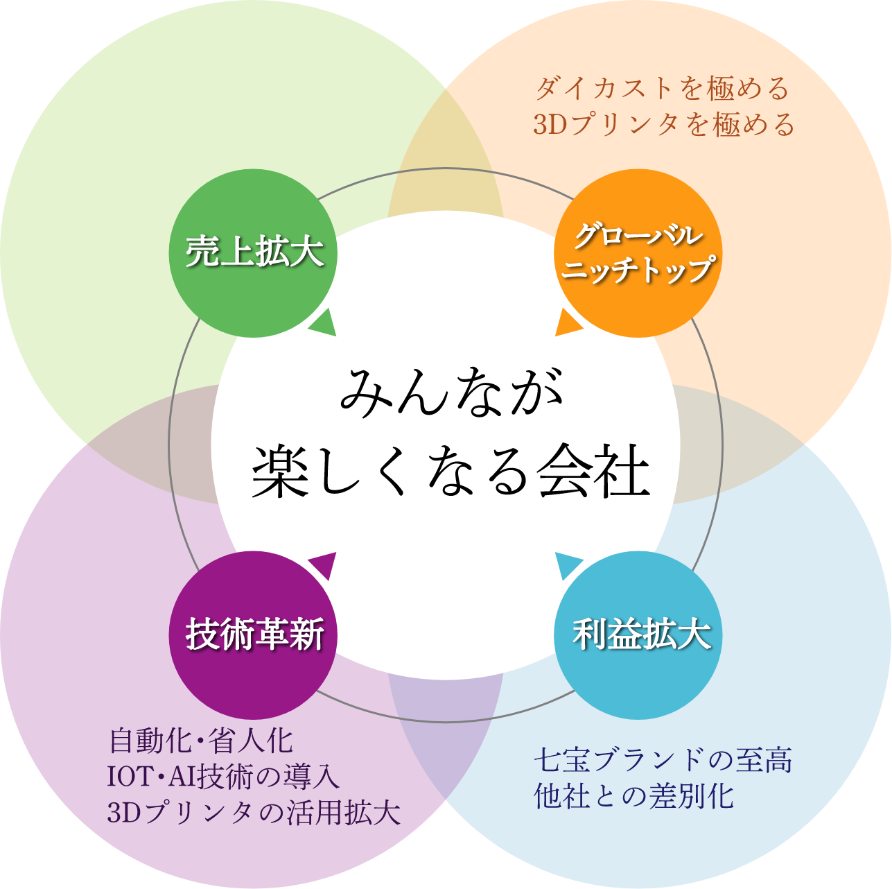 そのための環境づくりは私が全力でサポートします。大企業と違い、やりたいことをすぐ実行できるオーナー企業の強みを生かし、スタッフの意見を吸い上げながら、“チーム七宝”で前進し、みんなが希望の持てる会社にしていきたいと思っています。そしてそれが、なかなか3K(きつい・汚い・危険)のイメージが抜けきらない保守的な日本の製造業のイメージを払拭し、もの創り=カッコイイ仕事というイメージが若者に伝わっていけば業界の発展にもつながるので最高ですね。